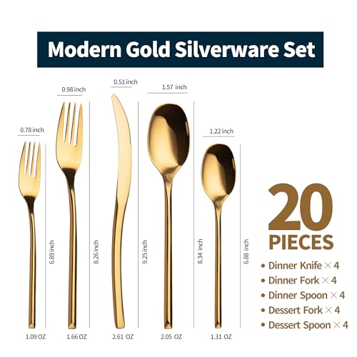 Specification: 20-Piece Gold Silverware Set for 4,Modern 18/10 Stainless Steel Flatware Set,Luxury Cutlery Set,Unique Utensils Set for Restaurant,Spoons and Forks Set,Mirror Polished,Dishwasher Safe