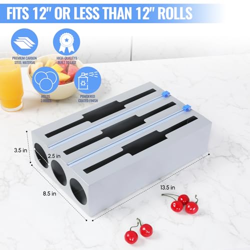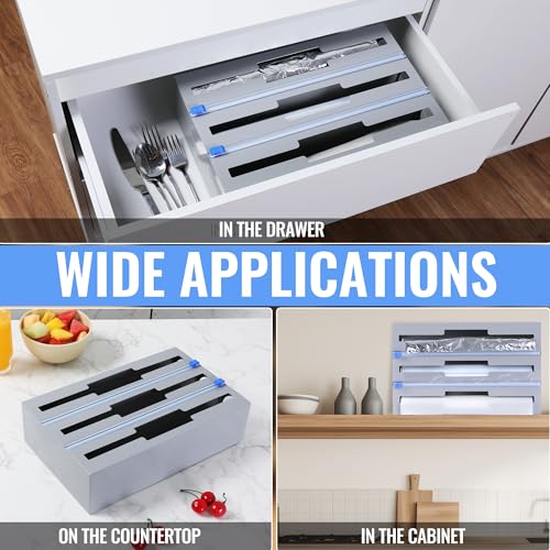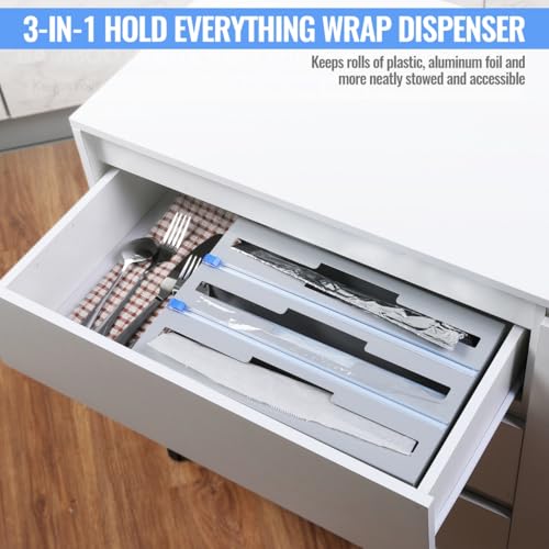 3 in 1 Plastic Wrap Dispenser with Cutter,Metal Foil and Plastic Wrap Organizer,Aluminum Foil and Wax Dispenser for Kitchen Drawer Storage Organization