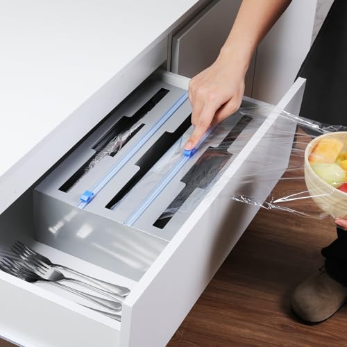 Specification: 3 in 1 Plastic Wrap Dispenser with Cutter,Metal Foil and Plastic Wrap Organizer,Aluminum Foil and Wax Dispenser for Kitchen Drawer Storage Organization