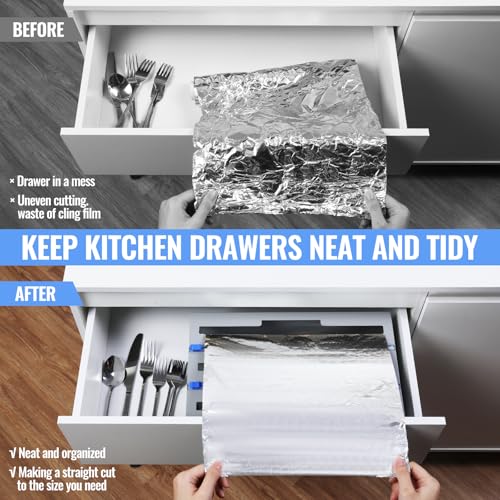 【SIZE&MORE INFO】-Overall: 13.5″L x 8.5″W x 3.5″H,fits well into most standard kitchen drawers.Suitable for Wax paper, Aluminum foil, Cling Wrap, Tin foil, Baking sheets etc. rolls up to 12”.