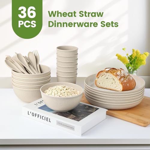 36-Piece Wheat Straw Dinnerware Sets for 6, Farielyn-X Unbreakable Reusable Set Kitchen Cups, Plates, Bowls Sets & Cultery Dishwasher Microwave Safe – Patio, Outdoors, RV, Camping Dishes