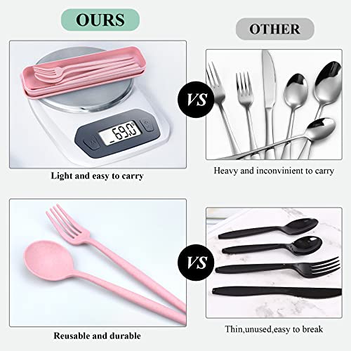 Travel utensils with case: Reusable utensils set with case contains pink, eige, blue, green four colors cutlery set. Reusable fork and spoon set for lunch box can easily eat bread,pastries,salads,pasta,chicken,etc. Utensils are perfect alternatives to the black silver set, travel silverware, plastic cutlery set, disposable cutlery. Portable utensils set with case are perfect lunch box accessories for adult