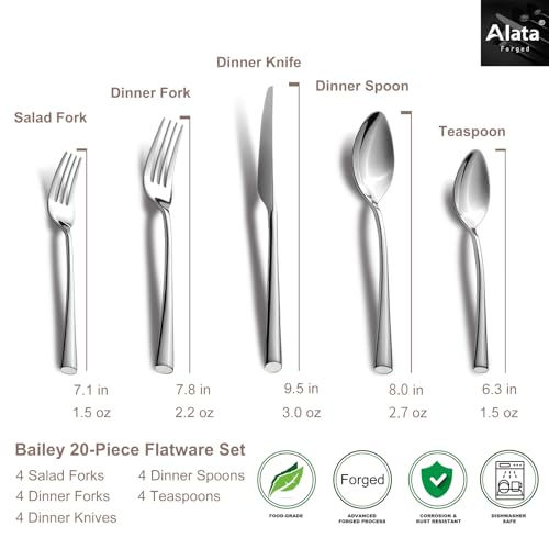 Alata Bailey 20-Piece Forged Silverware Set Stainless Steel Flatware Set,Service for 4,Mirror Polished Cutlery Set,Dishwasher Safe…