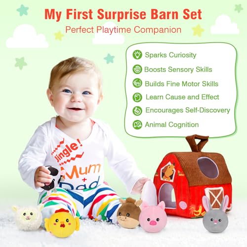 Baby Toys 6-12 Months: Plush Surprise Barn with Stuffed Farm Animals, Rattle, Crinkle Paper, Mirror, Busy Montessori Toys for Babies, Infant, Newborn, Sensory Toys for Toddlers 1-3