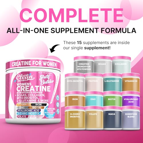 Creatine for Women | Creatine Monohydrate + BCAA Powder Myo-Inositol Collagen Biotin Hyaluronic Acid Folate L Glutamine Vitamin D3 Iron Zinc D-Chiro-Maca Digestion Shelf Builder by Clean Nutra