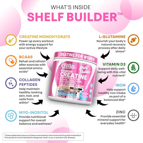 Specification: Creatine for Women | Creatine Monohydrate + BCAA Powder Myo-Inositol Collagen Biotin Hyaluronic Acid Folate L Glutamine Vitamin D3 Iron Zinc D-Chiro-Maca Digestion Shelf Builder by Clean Nutra