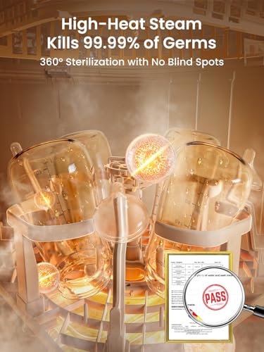 𝐄𝐟𝐟𝐢𝐜𝐢𝐞𝐧𝐭 𝐒𝐭𝐞𝐫𝐢𝐥𝐢𝐳𝐚𝐭𝐢𝐨𝐧 𝐚𝐧𝐝 𝐃𝐫𝐲𝐢𝐧𝐠: The 212°F high-temperature steam kills 99.99% of germs effectively, the subsequent hot air drying ensures bottles are spotless and ready for immediate use. This baby bottle sterilizer and dryer provides a hygienic environment for your baby.