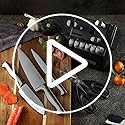 VALUE SET – 15 pieces all-in-one restaurant-grade precision knife set includes knives suitable for various cooking tasks: 8″ chef knife, 8″ slicing knife, 5″ fine edge santoku knife, 5.5″ serrated utility knife, 5″ utility knife, 3.5″ paring knife, 6pcs 4.5″ serrated steak knives, 2 pairs of kitchen shears, and knife block with built-in sharpener. This razor-sharp knife set slices tomatoes paper-thin & bones chicken effortlessly. The variety of knives can cover all cooking needs, great for everyday use.