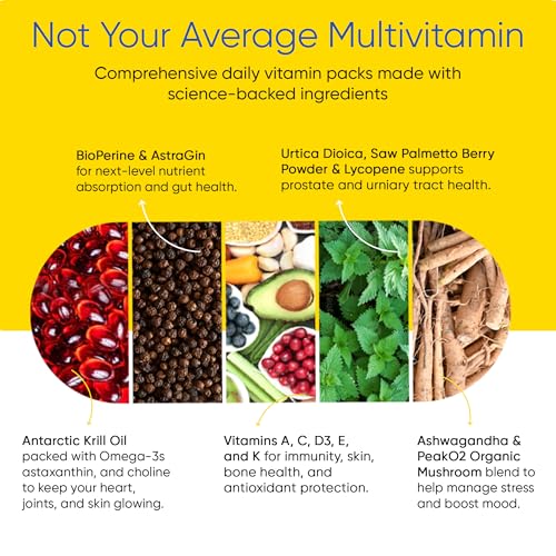 Men’s Total Health Daily Vitamin Packs – 22 Essential Minerals & Vitamins for Men, All-in-One Multivitamin Supplement for Energy, Stress Support, Heart, Gut Health with Krill Oil, Adaptogens – 30 Pack