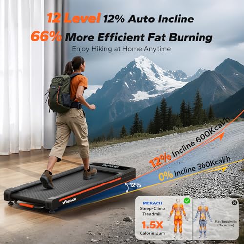 MERACH W50 Walking Pad Treadmills for Home, 12% Auto Incline, 400lbs Capacity, 3.5HP Supper Quiet Brushless, 16.5″x41.3″ Spacious Running Belt, Under Desk Treadmill with Remote & LED