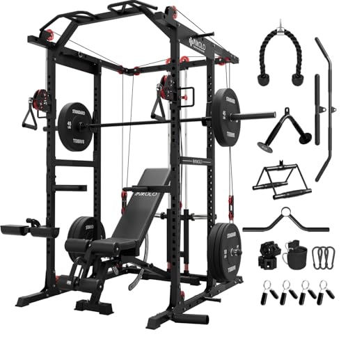 Mikolo K6 Ultra Power Cage with 230LBS Weight Plates, Power Rack with Aluminum Pulley System, 1500LBS Squat Rack with LAT Pull Down System, Functional Trainer for Home Gym