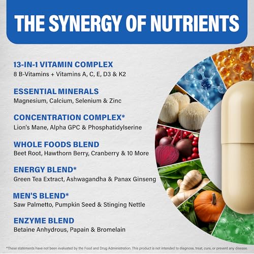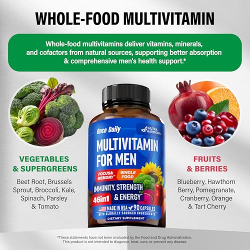 Specification: Multivitamin for Men – B-Complex | Whole Foods & Enzymes – Energy, Focus & Brain | Men’s Health Complex – 46in1 Mens Multivitamin – Bioavailable & Gentle on Stomach – Made in USA – 90 Capsules, 1/Day