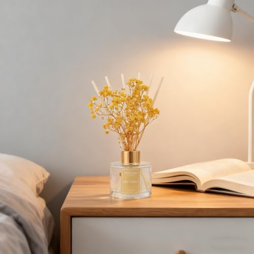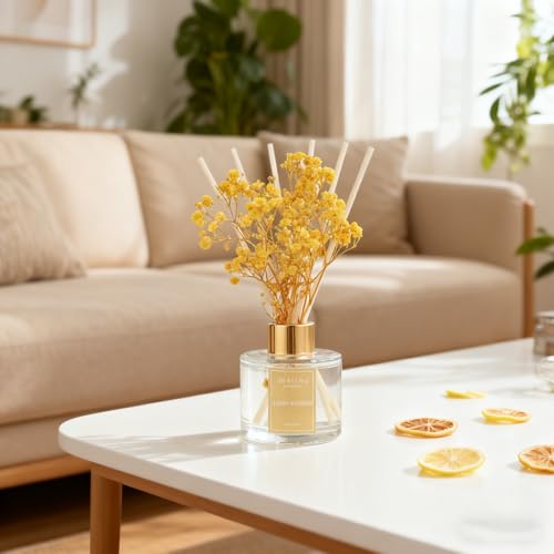 Included:(l)A bottle of fragrance diffuser(2)3.38 ounces of scentedblend essential oils(3)A pack of real preserved baby’s breath flowers (4)6pure cotton sticks You can choose to add or reduce the number of reed sticksto suit your taste.