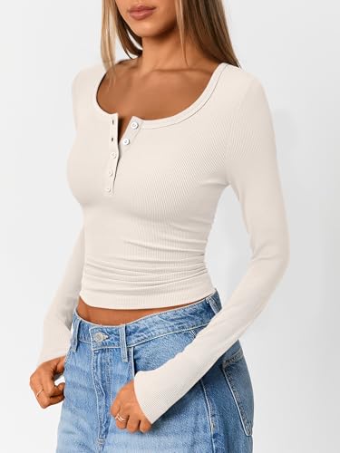 Trendy Queen Long Sleeve Shirts for Women Henley Ribbed Fall Tops Dressy Business Casual Teen Girl Winter Cute Basic Tees