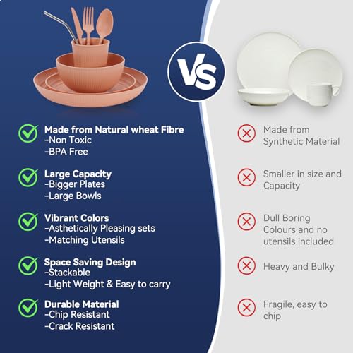 High quality and purity material:This Wheat Straw Dinnerware set is made of natural straw fiber & food grade safe PP materials. Its 100% BPA free, non-toxic. It is not only reusable, but also protects the health of you and your family because its material does not contain harmful chemicals. Choose our unbreakable dinnerware for a reliable and stylish option. Made from wheat straw, these dishes are lightweight and sturdy, offering a perfect blend of functionality and modern design for any dining setting.